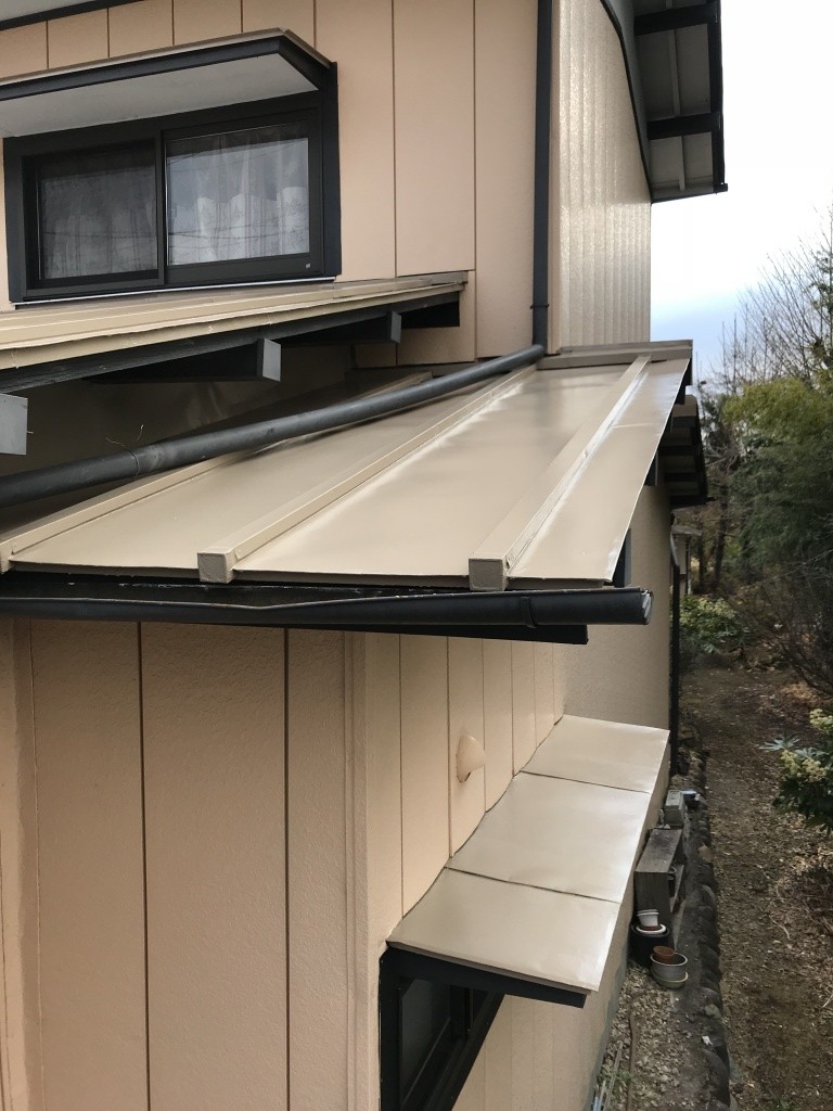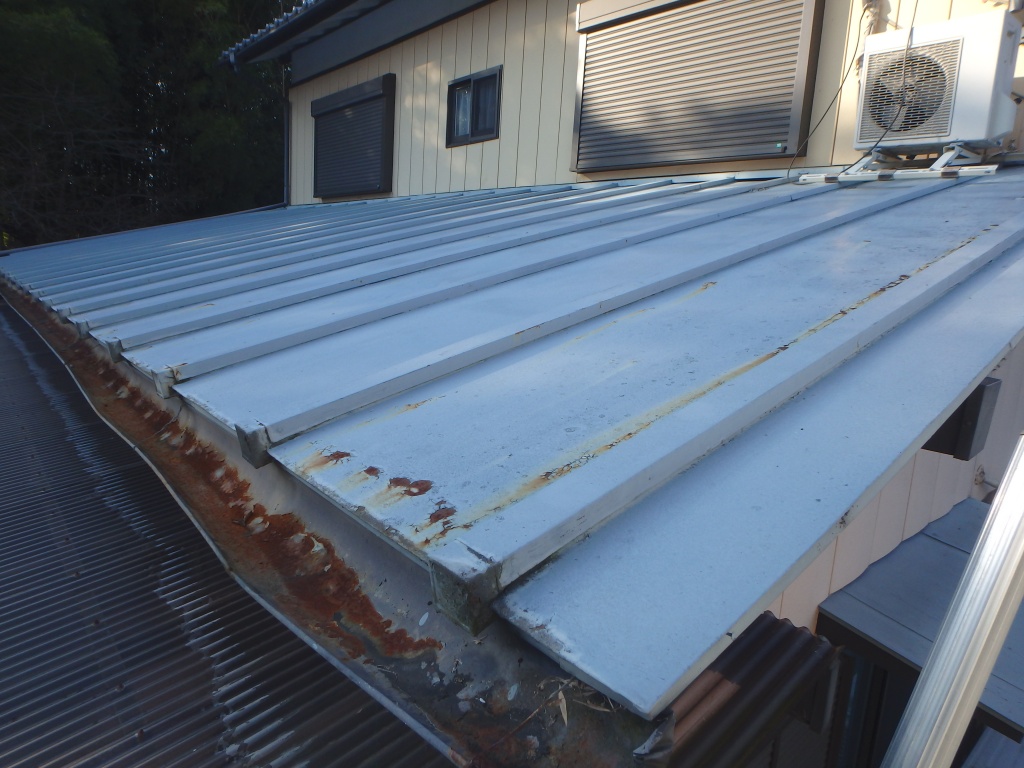 瓦棒屋根の事で、金属製の鉄板で出来ています。鉄板自体の厚みは0、4mm程度のため、定期的に塗装などのメンテナンスをしなければ、錆により破損してしまいます。