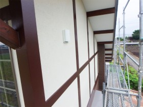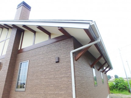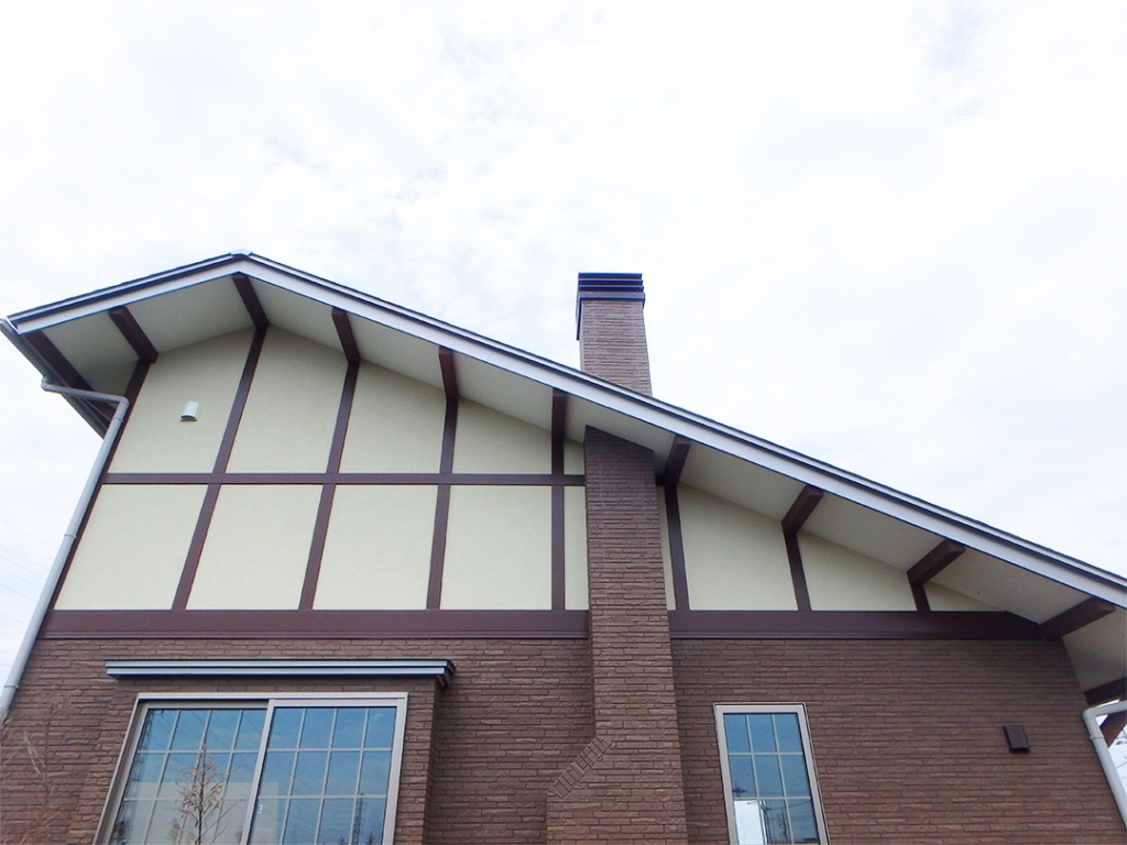 母屋部分と方杖をあらわしにし、外壁と同じ色に塗装することにより一体感がでます。